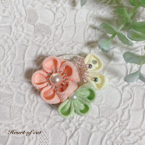 正方形にカットした小さな正絹の生地(シルク100%)を、ピンセットを使って折たたみ、花や蝶を作...